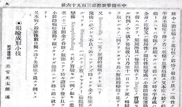 明治29(1896)年刊行の『中外医事新報』第396号に美甘先生が投稿した,「眼瞼成形小技」